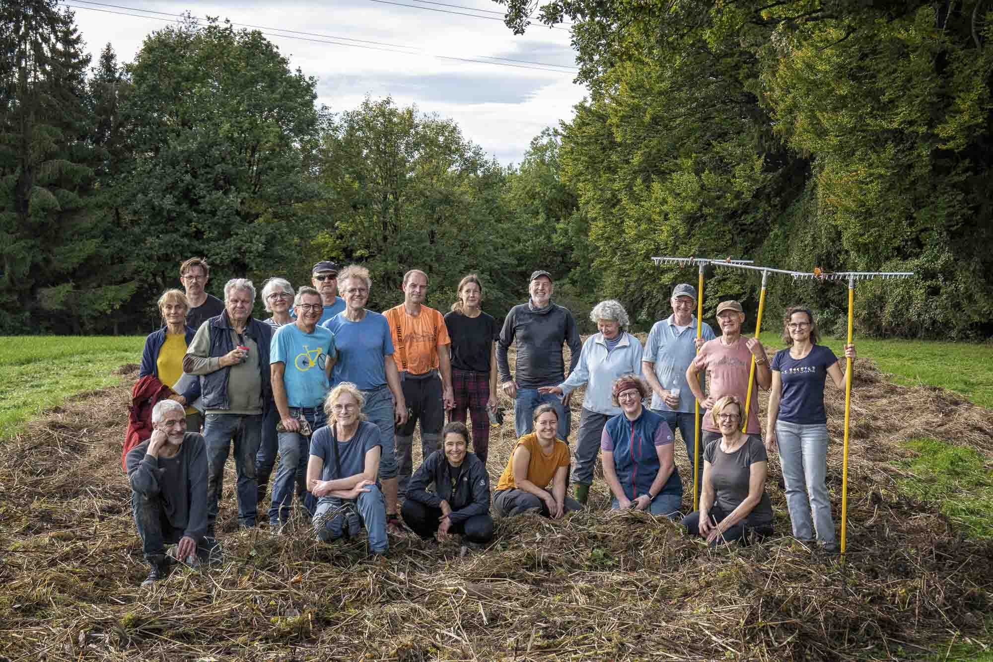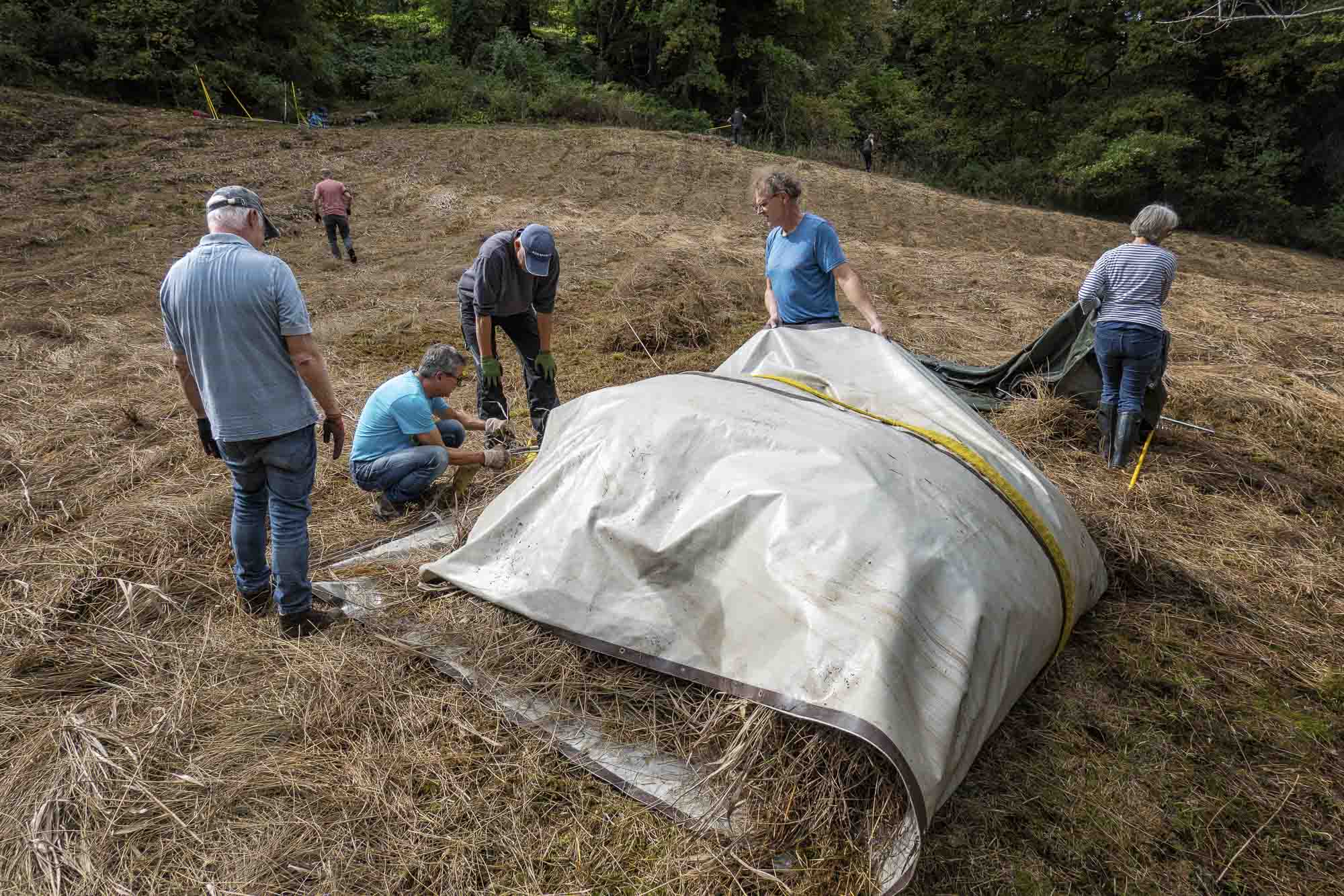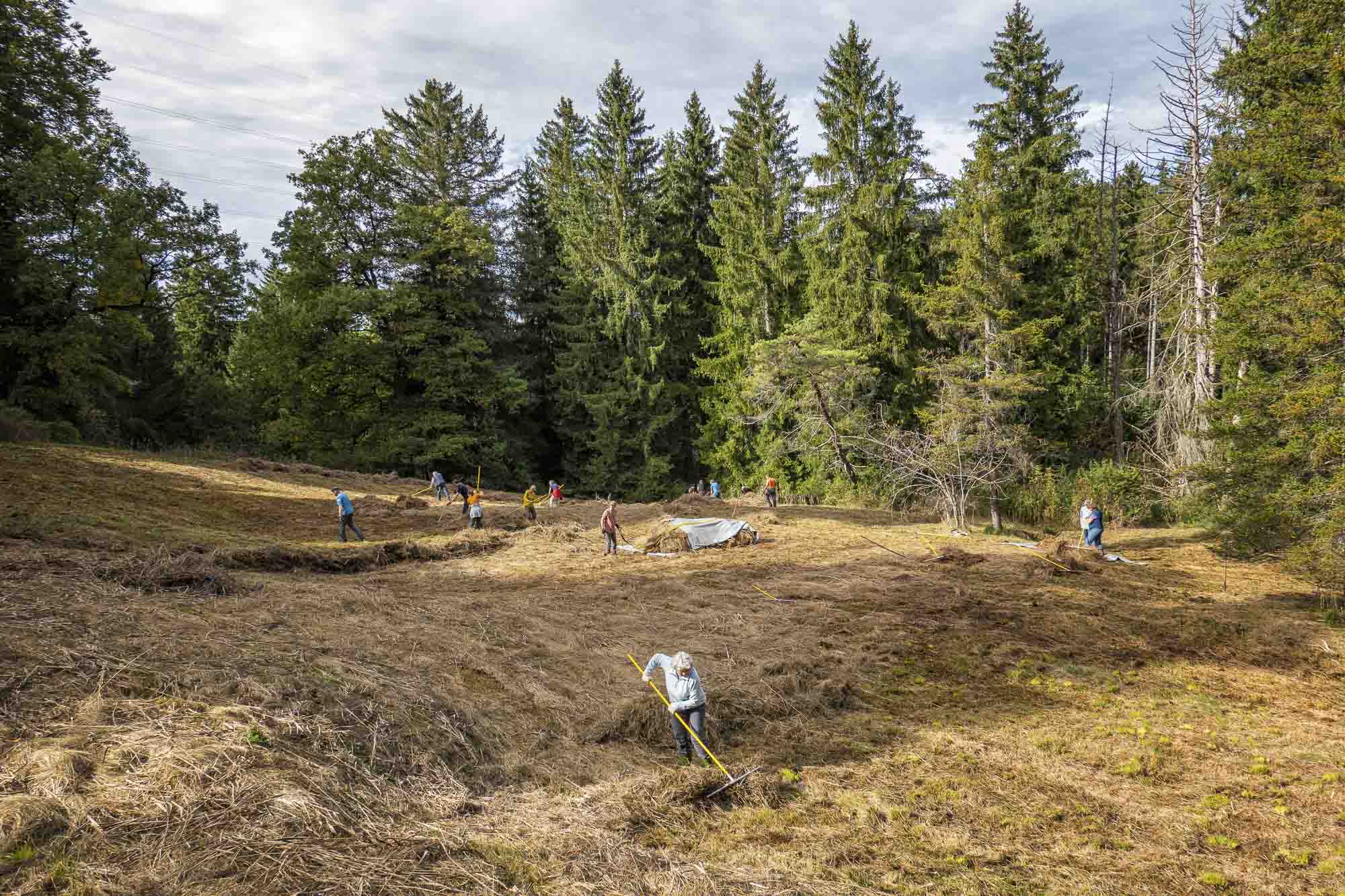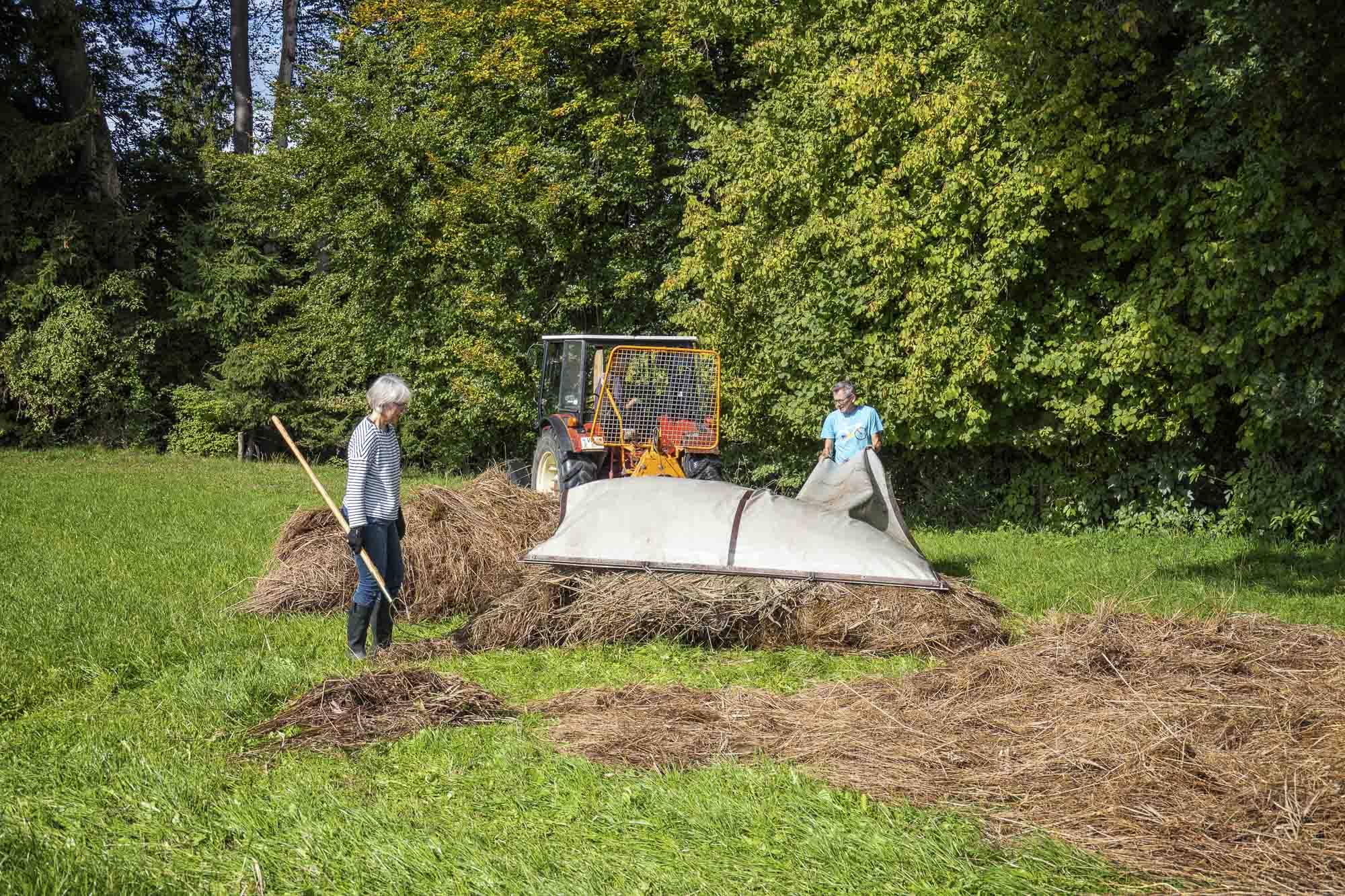 Deshalb haben wir diesmal auf Unterstützung durch Maschinenkraft gesetzt: Wir haben das Mähgut im Zentrum der Wiese zusammengetragen und auf spezielle, besonders stabile Planen gehäuft, die mit Gurten an einer Seilwinde befestigt werden konnten. So konnte ein Traktor das Mähgut den steilen Hang hinauf auf eine zweite, befahrbare Wiese ziehen, wo wir es zum Trocknen ausgebreitet haben. Hier konnte es später von einem Landwirt abgeholt und als Einstreu verwendet werden.