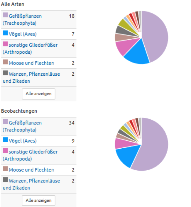 Dieser Screenshot zeigt die Zusammenfassung für die Zahl der verschiedenen Artgruppen und Beobachtungen
