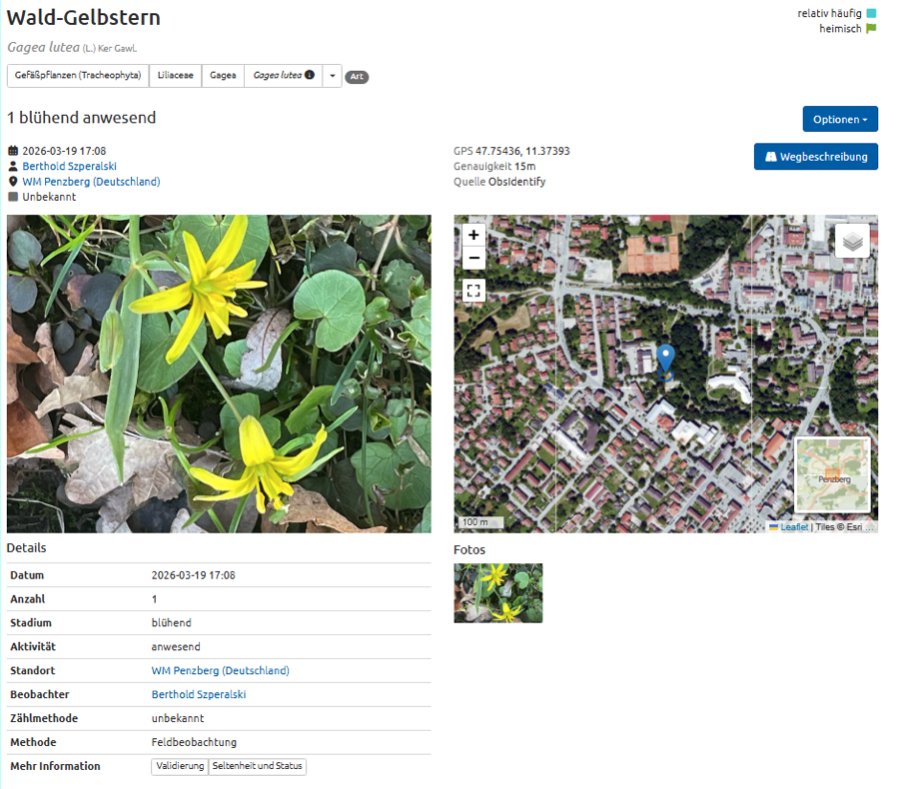 Für Penzberg haben wir einen sogenannten Bioblitz Penzberg 2026 erstellt, der die Beobachtungen der Ortschaft Penzberg ab dem 1.1.2026 erfasst und in Tabellen, Karten und Fotos zusammenfasst.