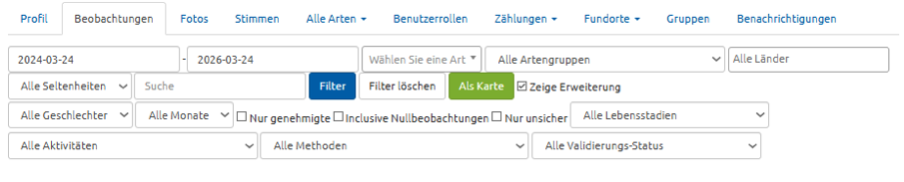 Anfangs- und Enddatum, Jahreszeit, Arten, Artgruppen, Länder etc.. Wichtig: Wenn die Filter eingestellt sind. unbedingt auf das blaue Feld „Filter drücken.